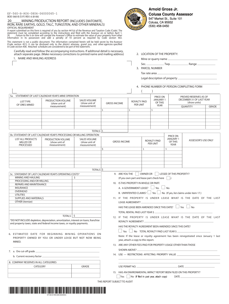 Arnold Gross Jr. Column County Assessor EF-560-B-R06-0806-06000065-1 BOE-560-B (S1F) REV. 6 (8-06) 547 Market St., Suite 101 Column, CA 95932 (530) 458-0450 are OFFICIAL REQUIREMENT A report submitted