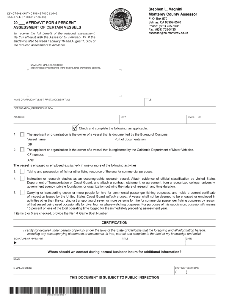 CERTIFICATION. ?. BOE-576-E (P1) REV. 07 (09-08). 20 Affidavits FOR 4 PERCENT. ASSESSMENT OF CERTAIN VESSELS. To receive the full benefit ...
