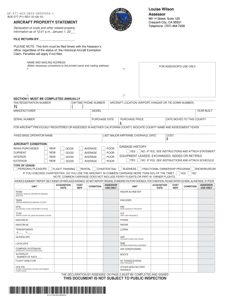 Louise Wilson Assessor EF-577-R03-0810-08000056-1 BOE-577 (P1) REV. 03 (08-10) 981 H Street, Suite 120 Crescent City, CA 95531 Telephone: (707) 464-7200 AIRCRAFT PROPERTY STATEMENT Declaration of