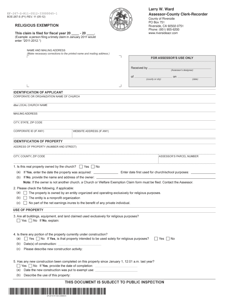 Larry W. Ward Assessor-County Clerk-Recorder EF-267-S-R11-0512-33000045-1 BOE-267-S (P1) REV. 11 (05-12) County of Riverside PO Box 751 Riverside, CA 92502-0751 Phone: (951) 955-6200 www.riversideacr.com