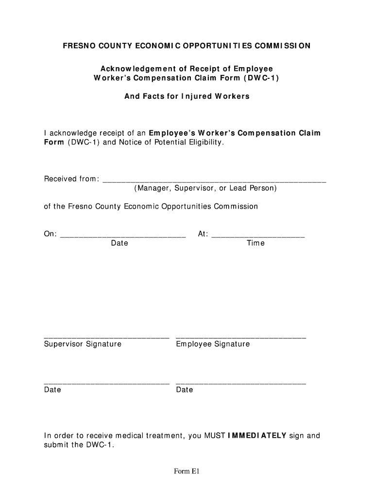 FRESNO COUNTY ECONOMIC OPPORTUNITIES COMMISSION Acknowledgement of Receipt of Employee Worker s Compensation Claim Form (DWC-1) And Facts for Injured Workers I acknowledge receipt of an Employee s