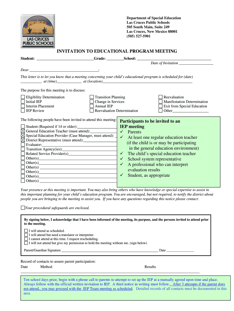 The Invitation to Educational Program Meeting is a form used by Las Cruces Public Schools to notify parents or guardians about an upcoming Individualized Education Program (IEP) meeting for their child.