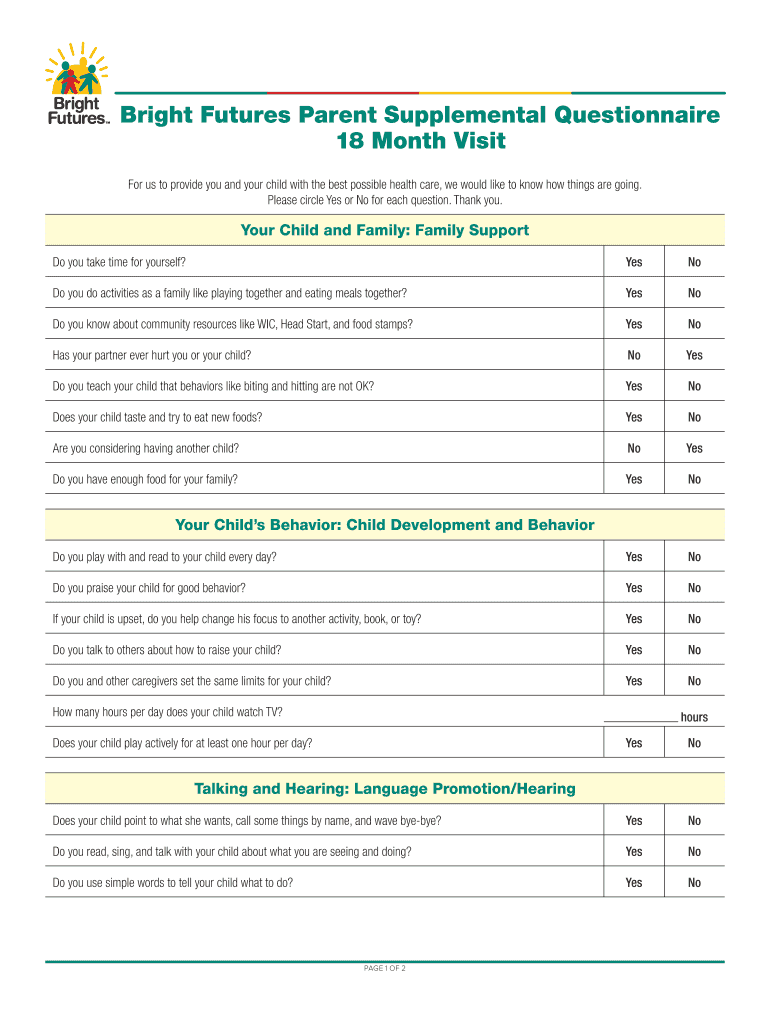 Get the free Bright Futures Parent Supplemental Questionnaire 18 Month ...