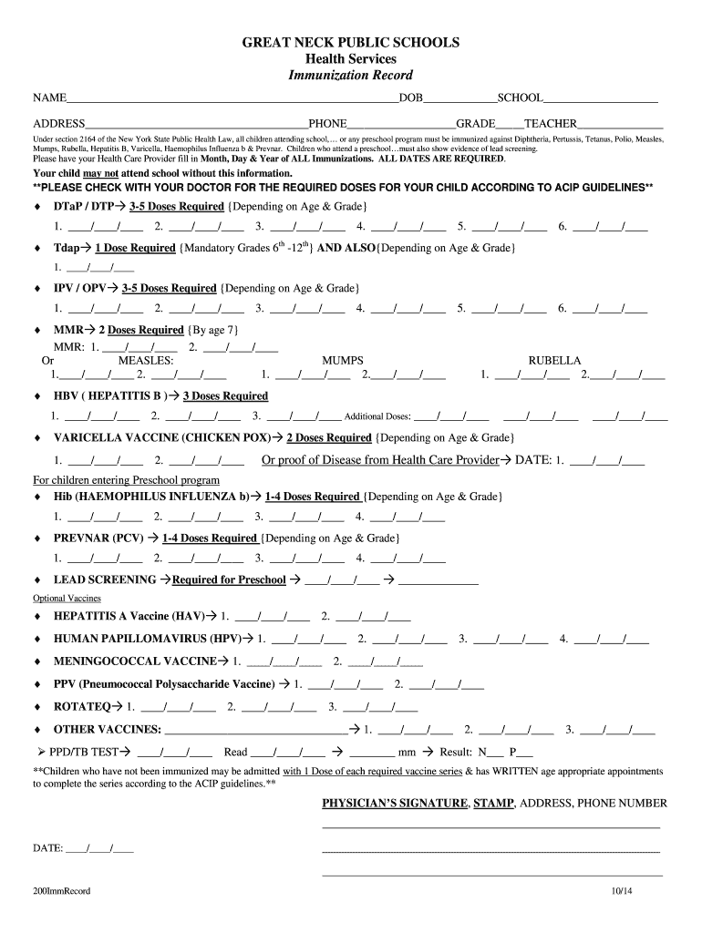 Get the free 200 - Immunization Record - Great Neck Public Schools