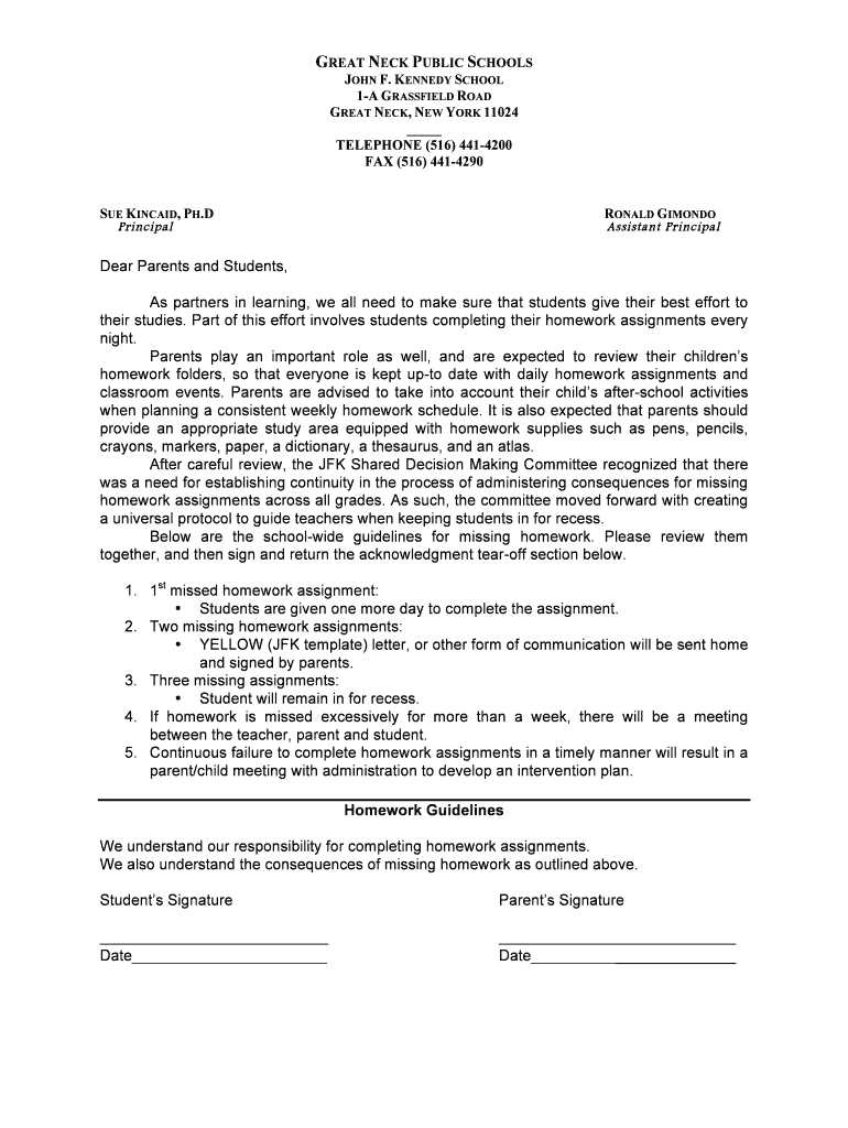 GREAT NECK PUBLIC SCHOOLS JOHN F. KENNEDY SCHOOL 1A GARFIELD ROAD GREAT NECK, NEW YORK 11024 TELEPHONE (516) 4414200 FAX (516) 4414290 SUE KINCAID, Ph.D. RONALD KIMONO Principal Assistant Principal