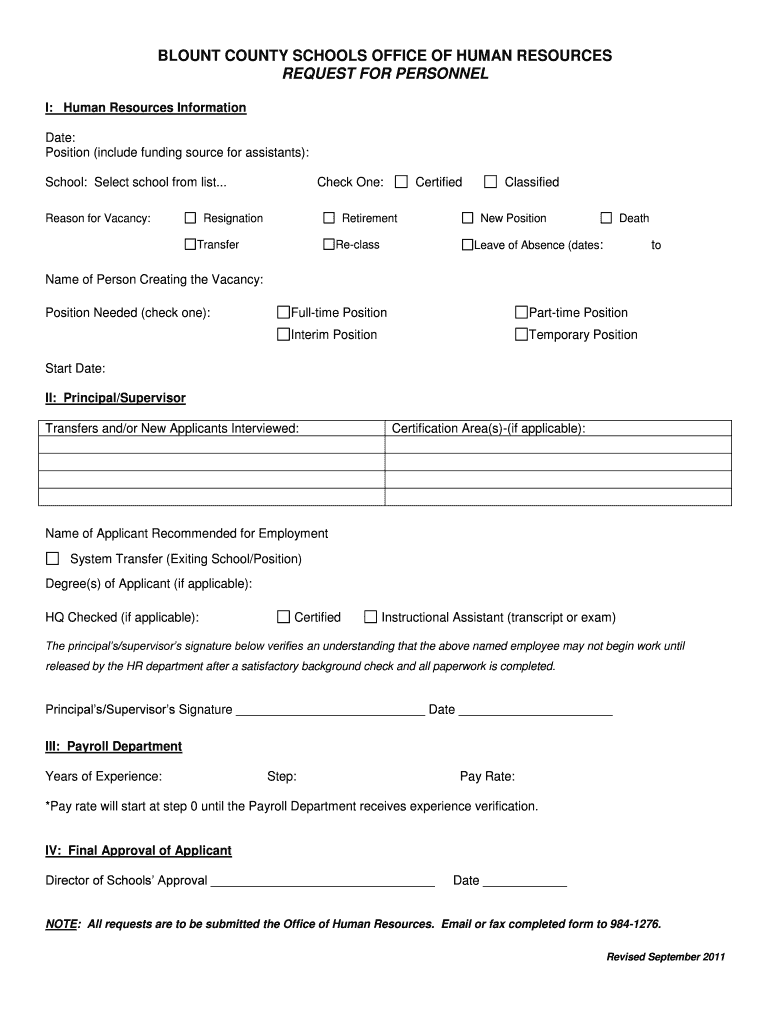 BLUNT COUNTY SCHOOLS OFFICE OF HUMAN RESOURCES REQUEST FOR PERSONNEL I: Human Resources Information Date: Position (include funding source for assistants): School: Select school from list... Reason