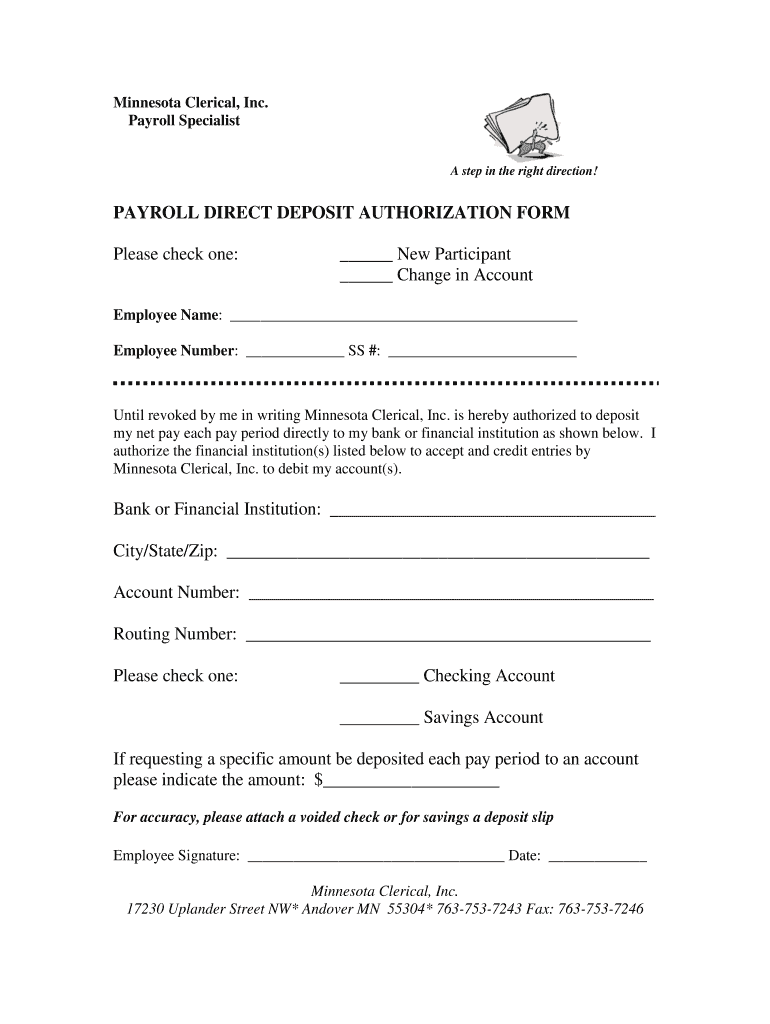 The Payroll Direct Deposit Authorization Form is an essential document that enables employees to authorize Minnesota Clerical, Inc. to deposit their net pay directly into their bank accounts. This form is important for both employees and employers as it streamlines the payroll process.
