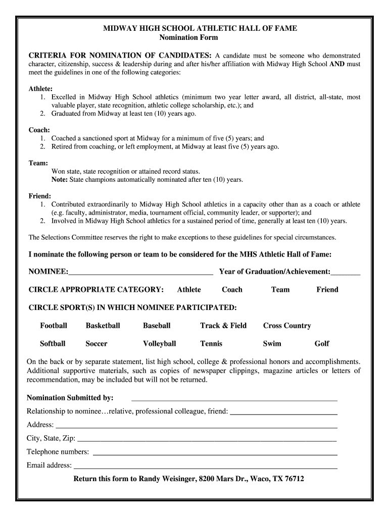 Get the free Athletic Hall of Fame Nomination Form - Midway ISD