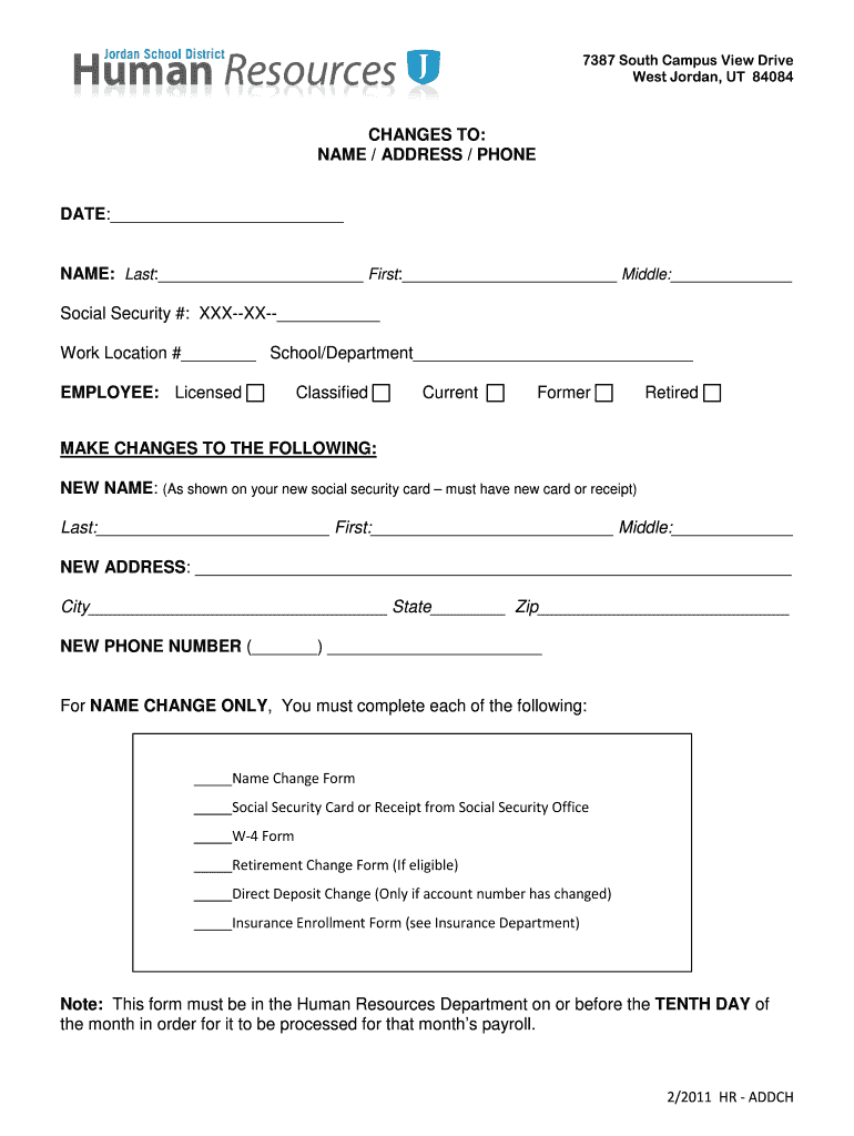 Get the free Name or Address Change Form - Jordan School District Human ...