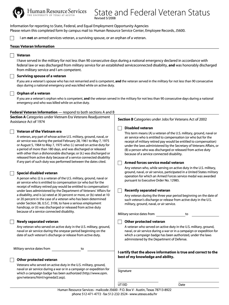 State and Federal Veteran Status Revised 5/2008 Information for reporting to State, Federal, and Equal Employment Opportunity Agencies Please return this completed form by campus mail to: Human Resource