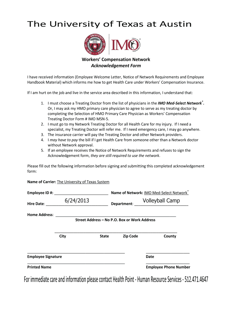 Workers Compensation Network Acknowledgement Form I have received information (Employee Welcome Letter, Notice of Network Requirements and Employee Handbook Material) which informs me how to get Health