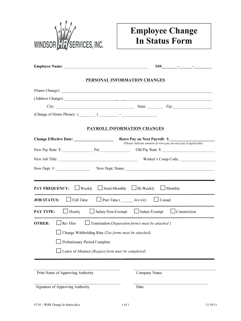 The Employee Change In Status Form is a vital document designed for employees and HR personnel to update personal and payroll information. Its primary purpose is to maintain accurate employee records, which is essential for compliance and ensuring payroll is managed correctly. This form plays a crucial role in updating details such as name, address, pay rate, and job title, helping organizations keep their employee data current.