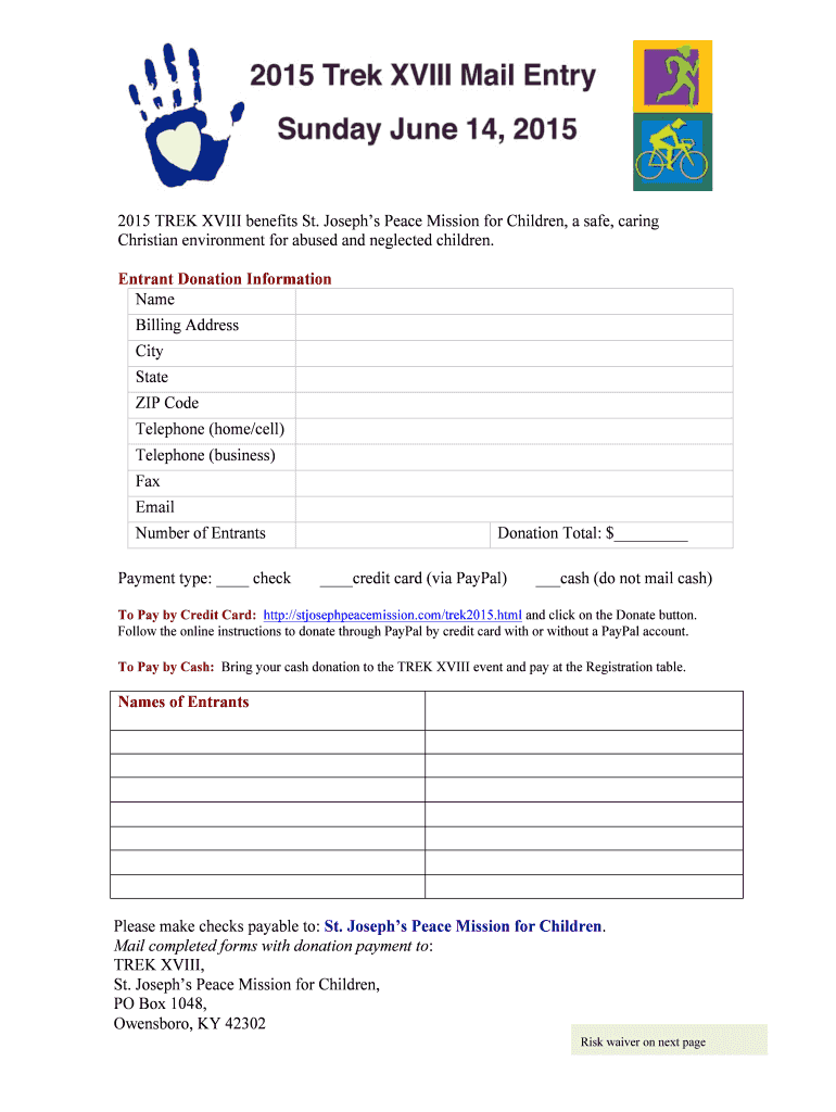 2015 TREK XVIII benefits St. Josephs Peace Mission for Children, a safe, caring Christian environment for abused and neglected children. Entrant Donation Information Name Billing Address City State