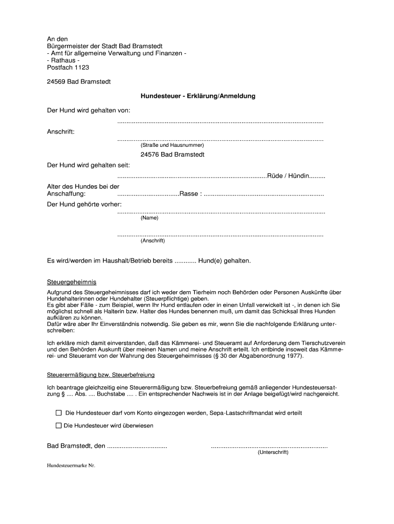 A den. B overmaster her Start Bad Boasted — Amt f r allegiance Verwaltung UND Finance — — Bauhaus — Postal 1123. 24569 Bad Boasted. Hundesteuer ...