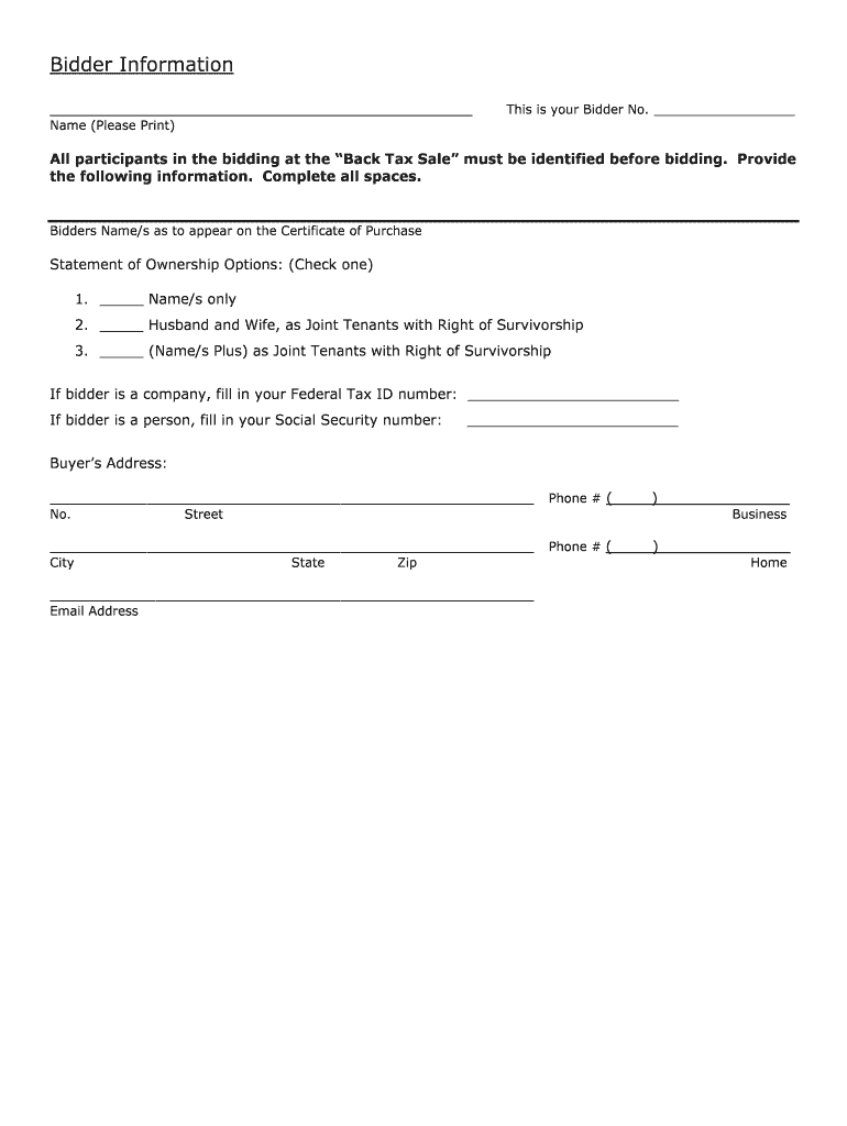 Bidder Information This is your Bidder No. Name (Please Print) All participants in the bidding at the Back Tax Sale must be identified before bidding. Provide the following information. Complete all