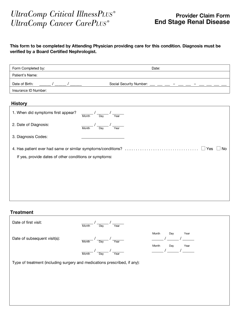 The UltraComp Critical IllnessPlus Provider Claim Form is designed for attending physicians who treat patients with critical illnesses. Specifically, physicians working with patients diagnosed with End Stage Renal Disease are required to utilize this form.