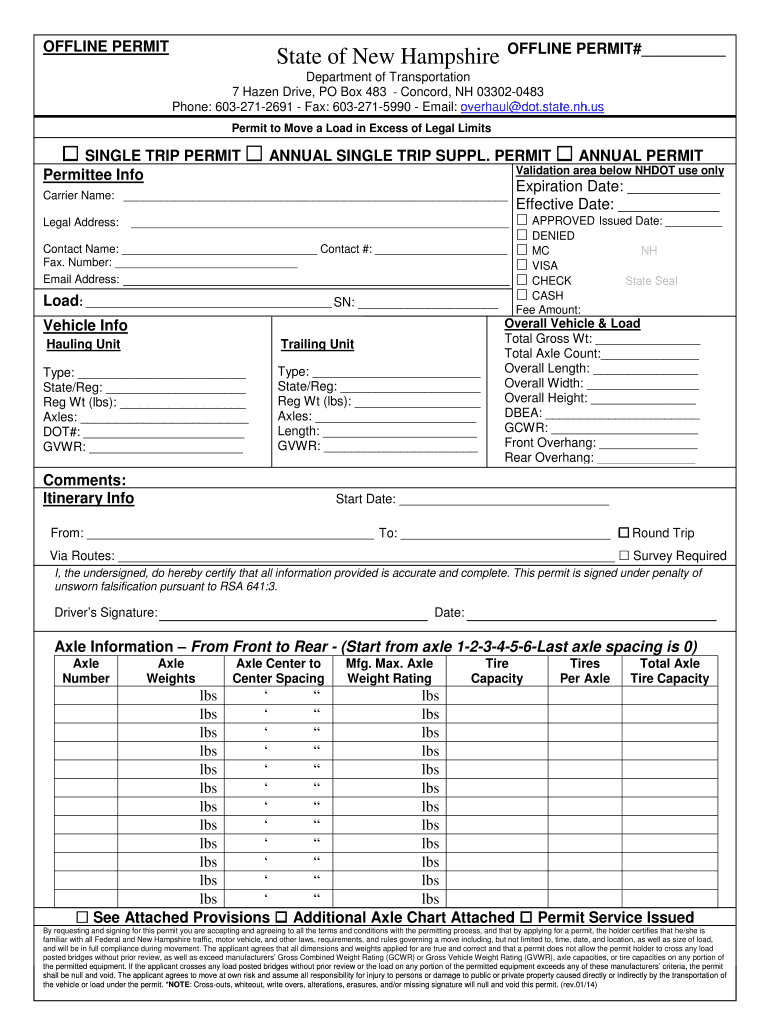 The New Hampshire Offline Permit is a government form used by drivers to request permission to move a load exceeding legal limits within the state.