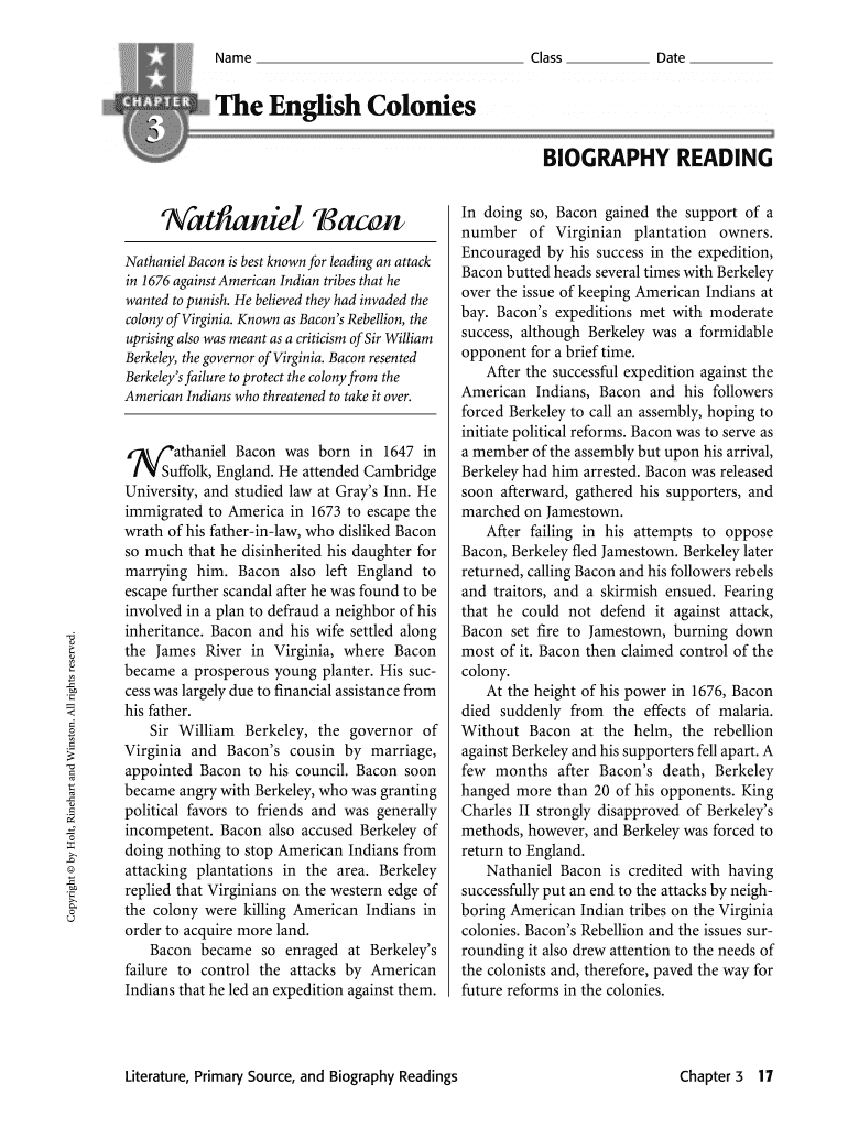Back Print Name Class Date 3 The English Colonies Nathaniel Bacon is best known for leading an attack in 1676 against American Indian tribes that he wanted to punish. He believed they had invaded