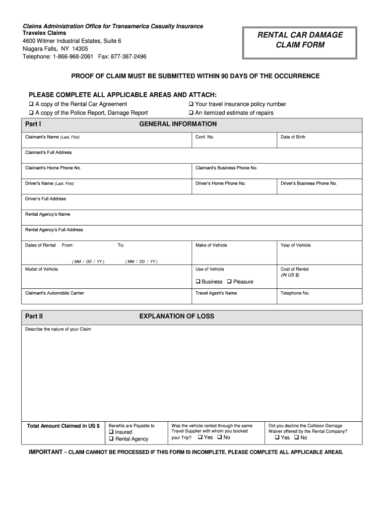 Claims Administration Office for Transamerica Casualty Insurance Traveled Claims 4600 Wither Industrial Estates, Suite 6 Niagara Falls, NY 14305 Telephone: 18669682061 Fax: 8773672496RENTAL CAR DAMAGE