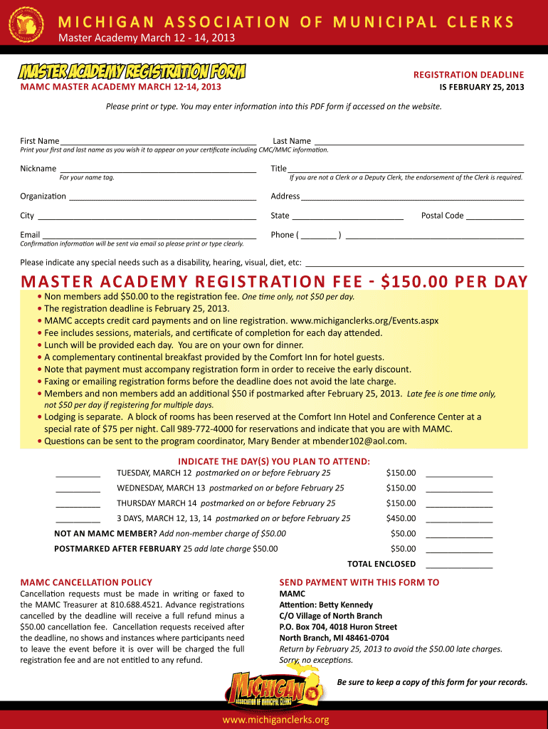 M I C H I G A N A S S O C I AT I O N O F M U N I C I PA L C L E R K S Master Academy March 12 14, 2013 Master Academy REGISTRATION FORM registration deadline MAC Master Academy March 12-14, 2013 is