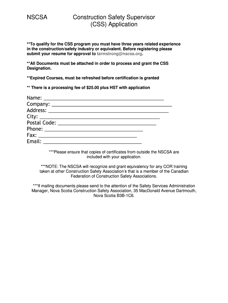 NS CSA Construction Safety Supervisor (CSS) Application **To qualify for the CSS program you must have three years related experience in the construction/safety industry or equivalent. Before registering