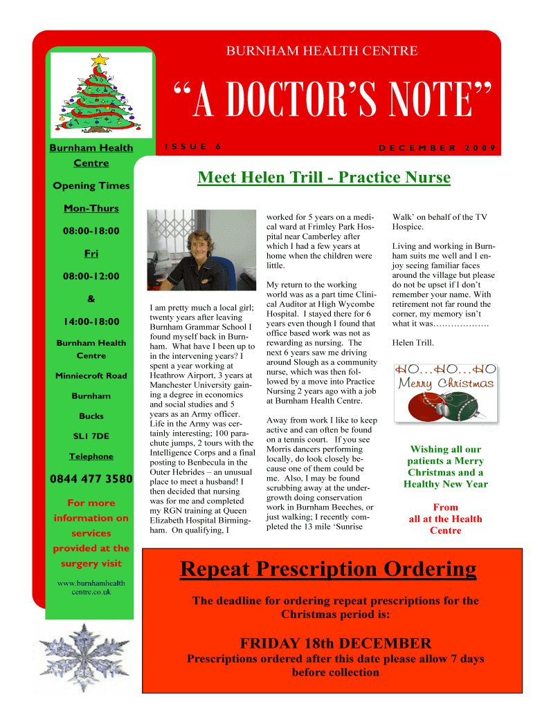 BURNHAM HEALTH CENT REA DOCTORS NOTE Burnham Health Center Opening Times ISS U E6D ECE M BE Meet Helen Trill Practice NurseMonThursworked for 5 years on a medical ward at Firmly Park Hospital near