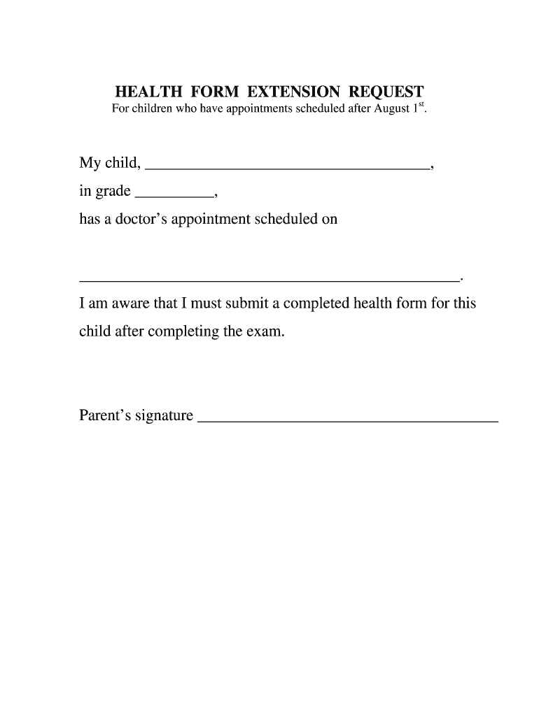 The Health Form Extension Request can be filled out by parents or legal guardians of students who have a scheduled doctor's appointment after August 1st.