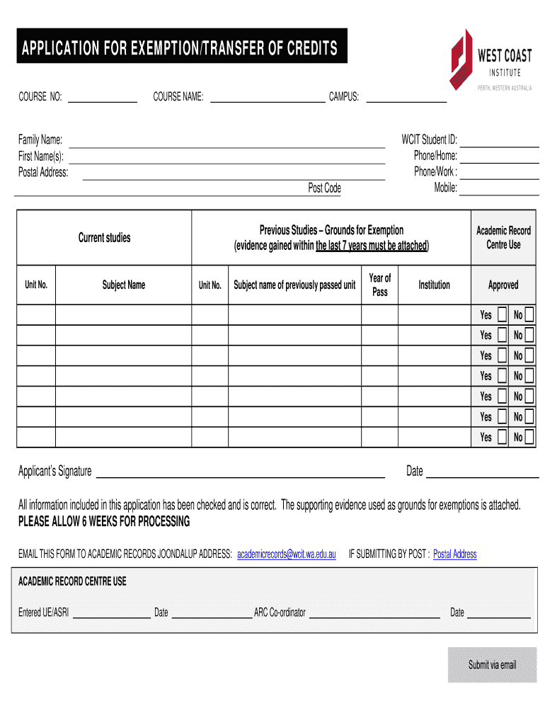 First Name(s): Postal Address: Phone/Work Po st Code. APPLICATION FOR EXEMPTION/TRANSFER OF CREDITS. COURSE NO: COURSE NAME: CAMPUS:
