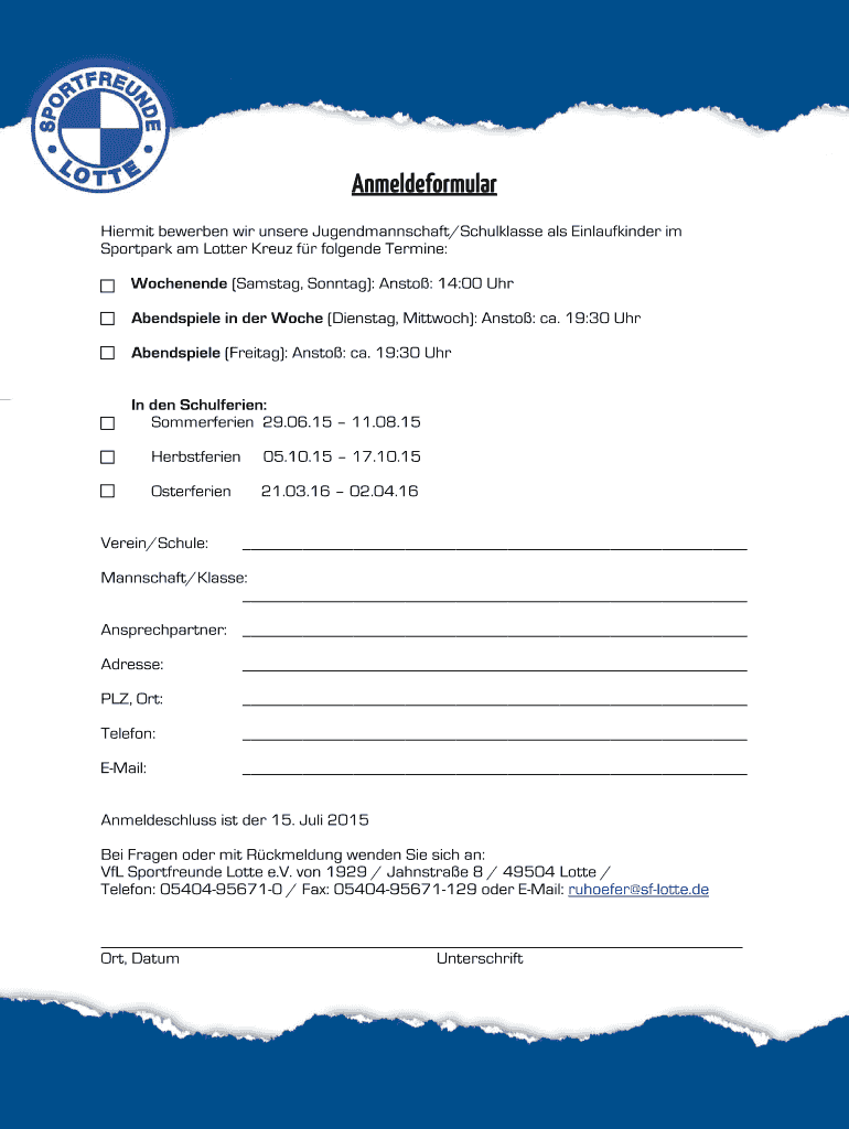 Anmeldeformular Hermit Beveren WIR unfair Jugendmannschaft/Schulklasse ALS Einlaufkinder I'm Sport park am Latter Cruz f r phosgene Termini: