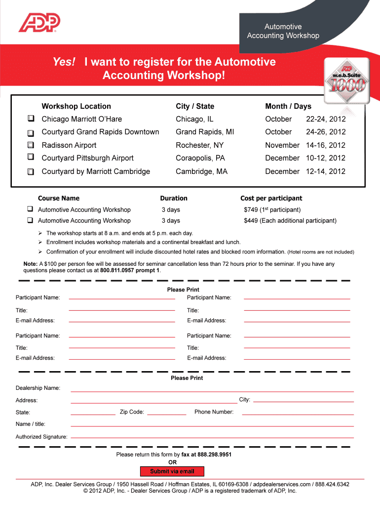 Automotive Accounting Workshop Yes! I want to register for the Automotive Accounting Workshop! Workshop Location City / State Month / Days Chicago Marriott O Hare Chicago, IL October 22-24, 2012 Courtyard