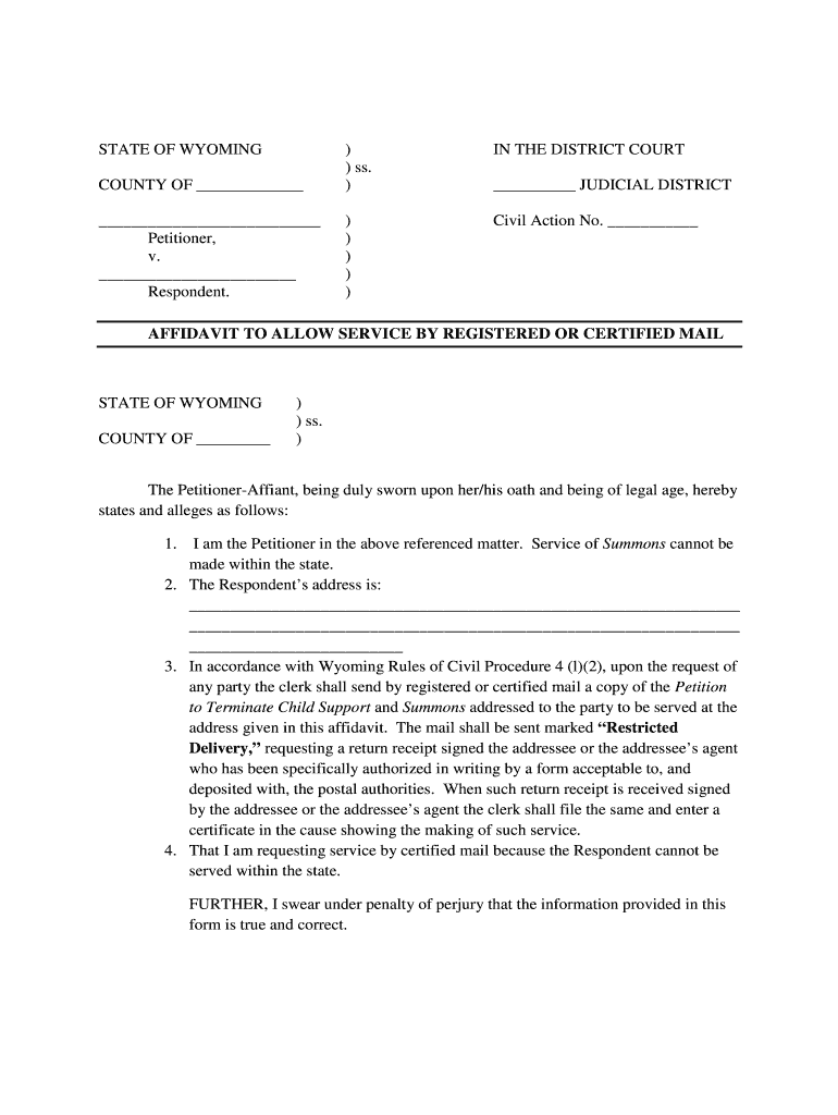 STATE OF WYOMING COUNTY OF)) SS. ) Petitioner, v. Respondent. ))))) IN THE DISTRICT COURT JUDICIAL DISTRICT Civil Action No. AFFIDAVIT TO ALLOW SERVICE BY REGISTERED OR CERTIFIED MAIL STATE OF WYOMING