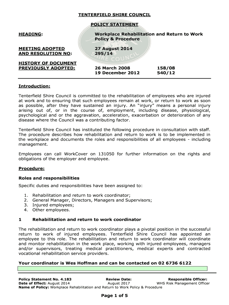 CHESTERFIELD SHIRE COUNCIL POLICY STATEMENT HEADING: Workplace Rehabilitation and Return to Work Policy & Procedure MEETING ADOPTED AND RESOLUTION NO: 27 August 2014 295/14 HISTORY OF DOCUMENT PREVIOUSLY