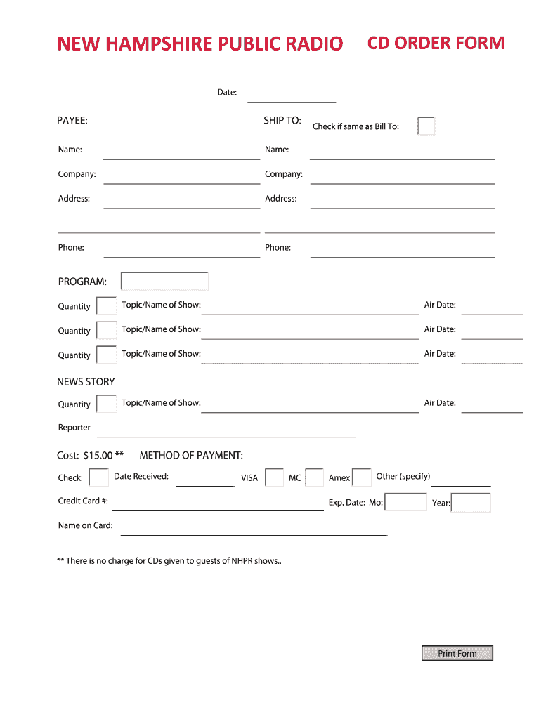 NEW HAMPSHIRE PUBLIC RADIO CD ORDER FORM Date: PAYEE: SHIP TO: Name: Name: Company: Company: Address: Address: Phone: Phone: Check if same as Bill To: PROGRAM: Quantity Topic/Name of Show: Air Date: