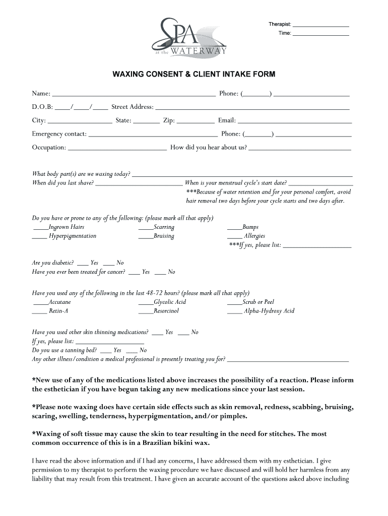 The waxing intake form typically requires information about the client's health history, allergies, medications, and previous waxing experiences.