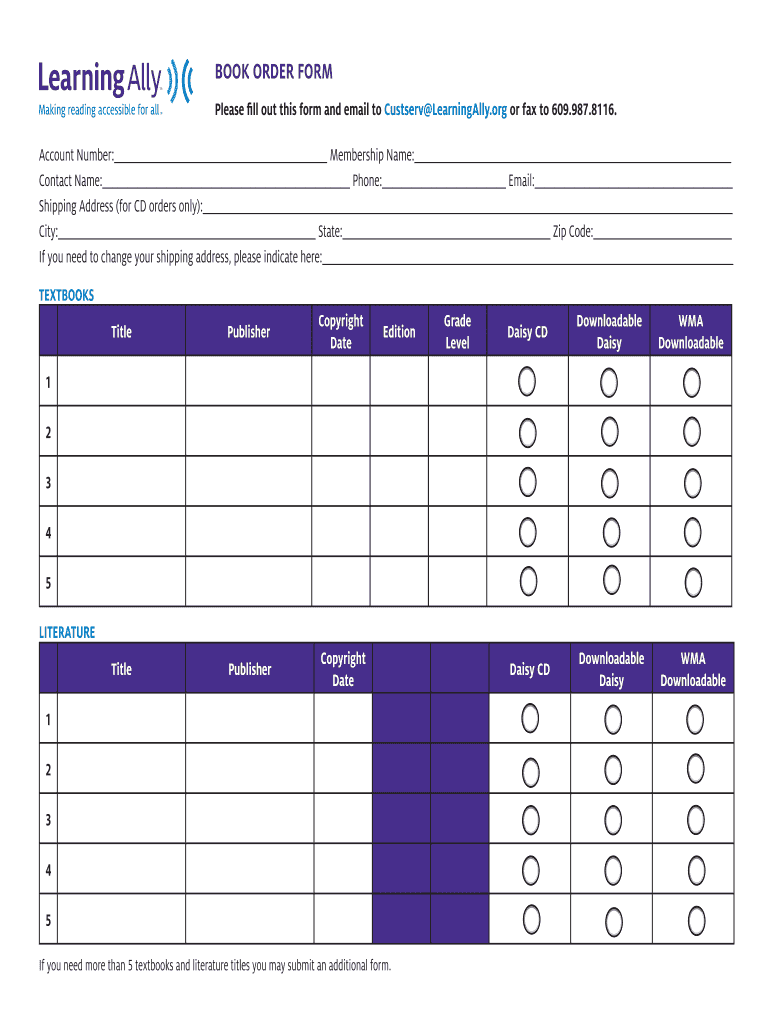 The Book Order Form is a specialized tool designed for ordering textbooks and literature from LearningAlly. This form streamlines the ordering process, allowing customers to efficiently select and purchase the materials they need for their educational pursuits. With its user-friendly interface, the Book Order Form enhances the overall experience of acquiring textbooks and literature.