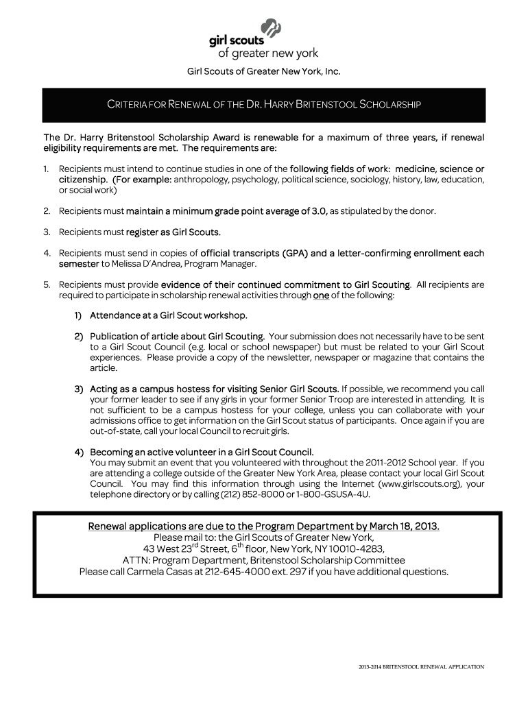 Girl Scouts of Greater New York, Inc. CRITERIA FOR RENEWAL OF THE DR. HARRY BRITENSTOOL SCHOLARSHIP The Dr. Harry Britenstool Scholarship Award is renewable for a maximum of three years, if renewal