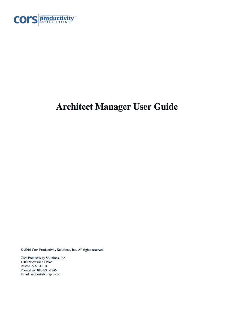 Architect Manager User Guide 2016 Cor's Productivity Solutions, Inc. All rights reserved. Cor's Productivity Solutions, Inc. 1100 North wind Drive Reston, VA 20194 Phone/Fax: 8882978845 Email: support