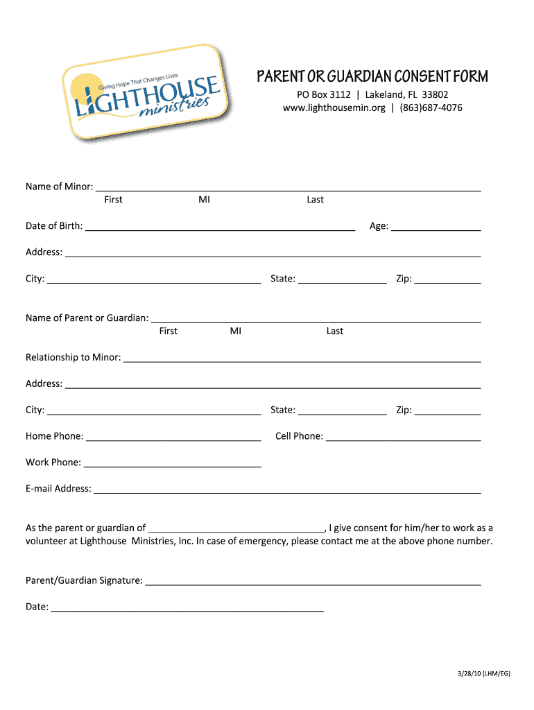 The Parent or Guardian Consent Form is a legal document used by parents or guardians to grant permission for a minor to volunteer at Lighthouse Ministries, Inc.