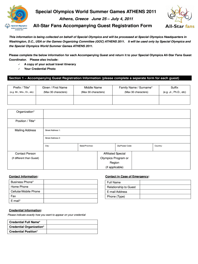 Special Olympics World Summer Games ATHENS 2011 Athens, Greece June 25 July 4, 2011 All-Star Fans Accompanying Guest Registration Form This information is being collected on behalf of Special Olympics