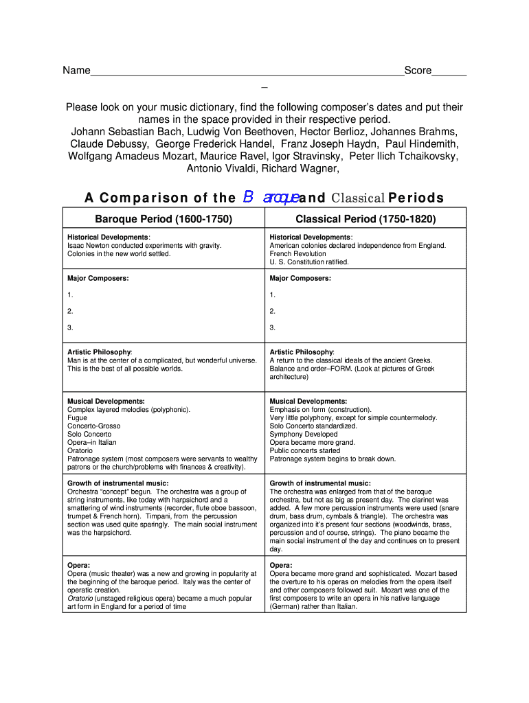 The Music History Comparison Worksheet serves as an essential educational tool, enabling students to explore and compare significant periods in music history. This worksheet is divided into structured sections, including Baroque, Classical, Romantic, and 20th Century, each designed to facilitate in-depth analysis. By utilizing this worksheet, students can develop a deeper understanding of various musical eras and their characteristics. The use of this music history worksheet is particularly beneficial for assignments focused on historical analysis and appreciation of music.