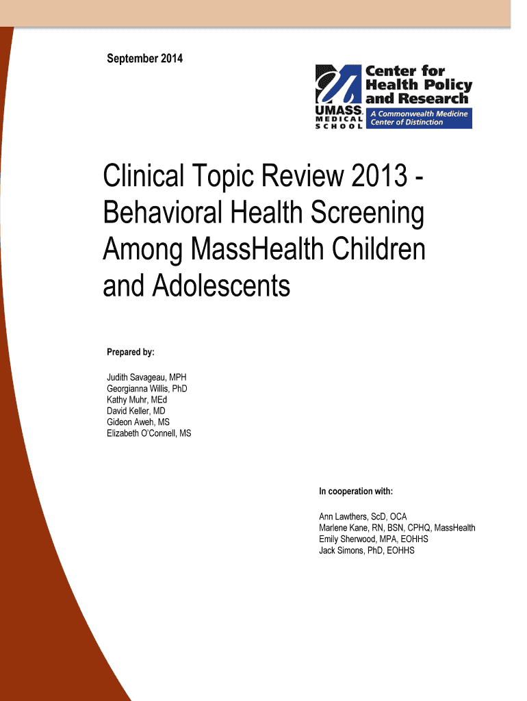 September 2014 Clinical Topic Review 2013 Behavioral Health Screening Among IMS Health Children and Adolescents Prepared by: Judith Savage, MPH Georgeanna Willis, PhD Kathy Muir, Med David Keller,