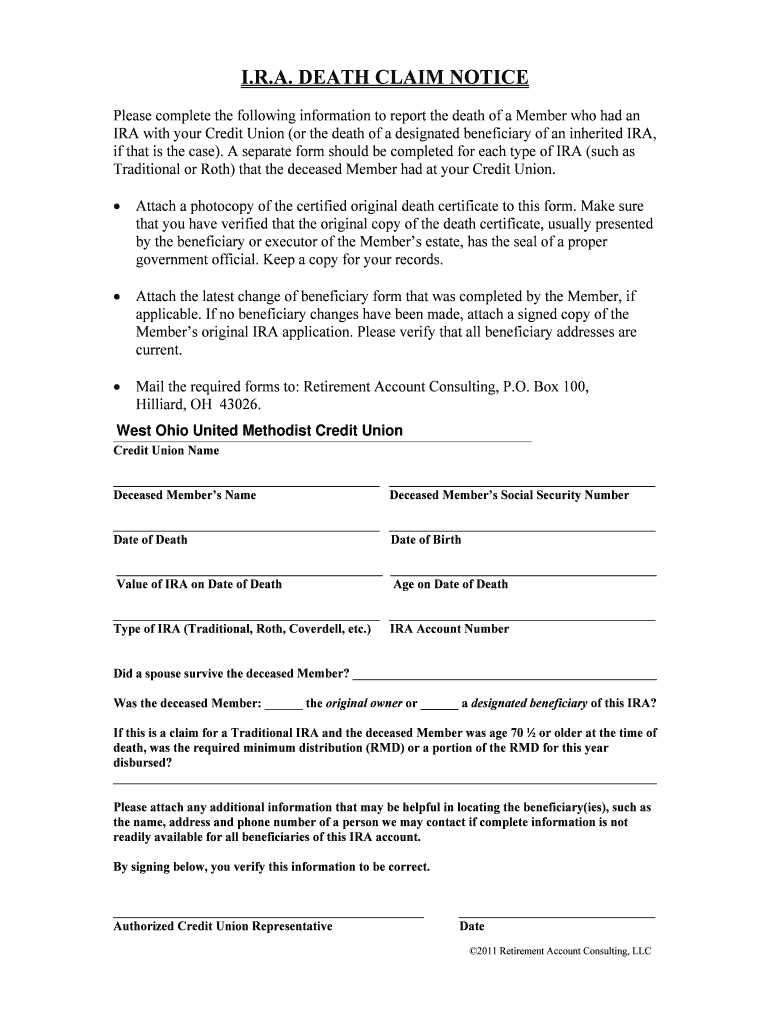 The IRA Death Claim Notice can be filed by beneficiaries named on the account, authorized credit union representatives, and executors of the deceased member's estate.
