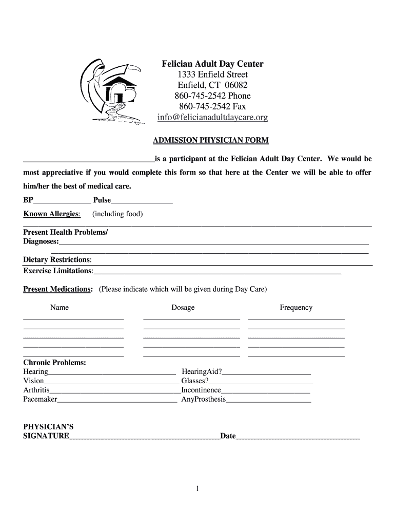 Felicia Adult Day Center 1333 Enfield Street Enfield, CT 06082 8607452542 Phone 8607452542 Fax info felicianadultdaycare.org ADMISSION PHYSICIAN FORM is a participant at the Felicia Adult Day Center.
