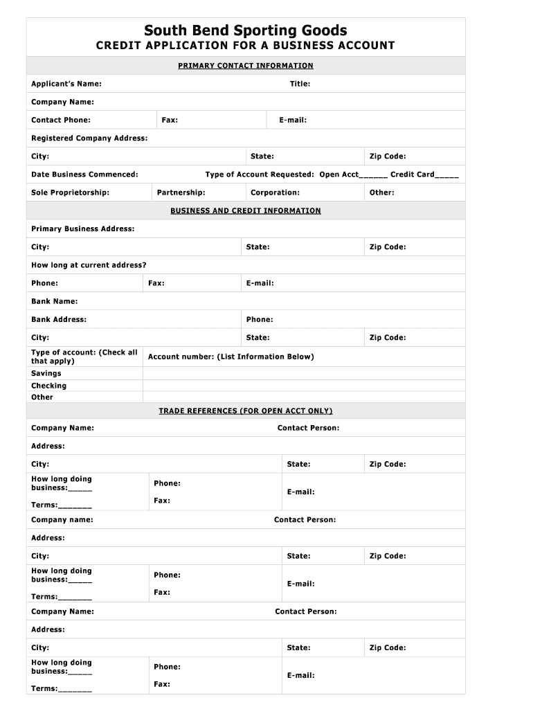 Any individual or business entity looking to establish credit with Southbend Company is required to file a new Southbend credit application.