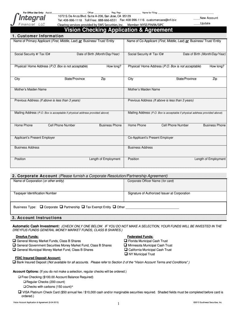 The Vision Checking Application & Agreement is a financial document used by individuals to apply for a Vision Account with Southwest Securities, Inc.