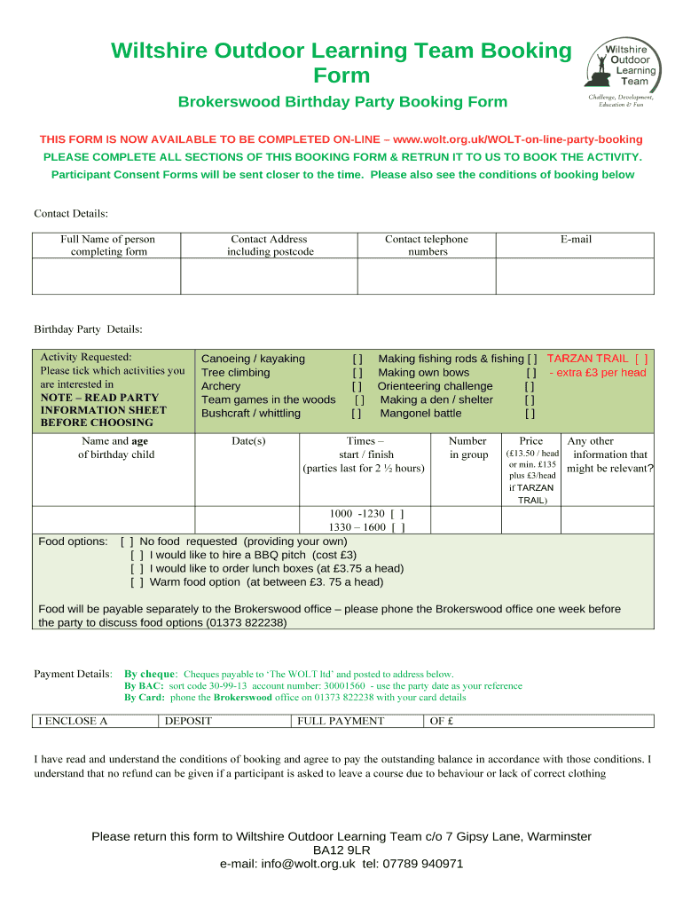 Wiltshire Outdoor Learning Team Booking Form Brokers wood Birthday Party Booking Form THIS FORM IS NOW AVAILABLE TO BE COMPLETED ONLINE www.wolt.org.uk/WOLTonlinepartybooking PLEASE COMPLETE ALL SECTIONS