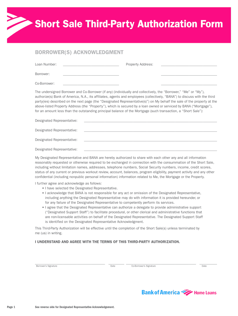 Borrowers and co-borrowers involved in a property that is undergoing a short sale are eligible to fill out this form to authorize communication between Bank of America and their representatives.