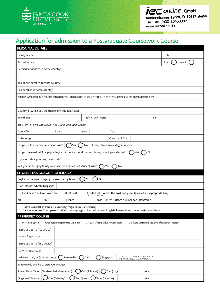 The Postgraduate Coursework Application Form is a college application document used by individuals to apply for postgraduate coursework programs at James Cook University (JCU).