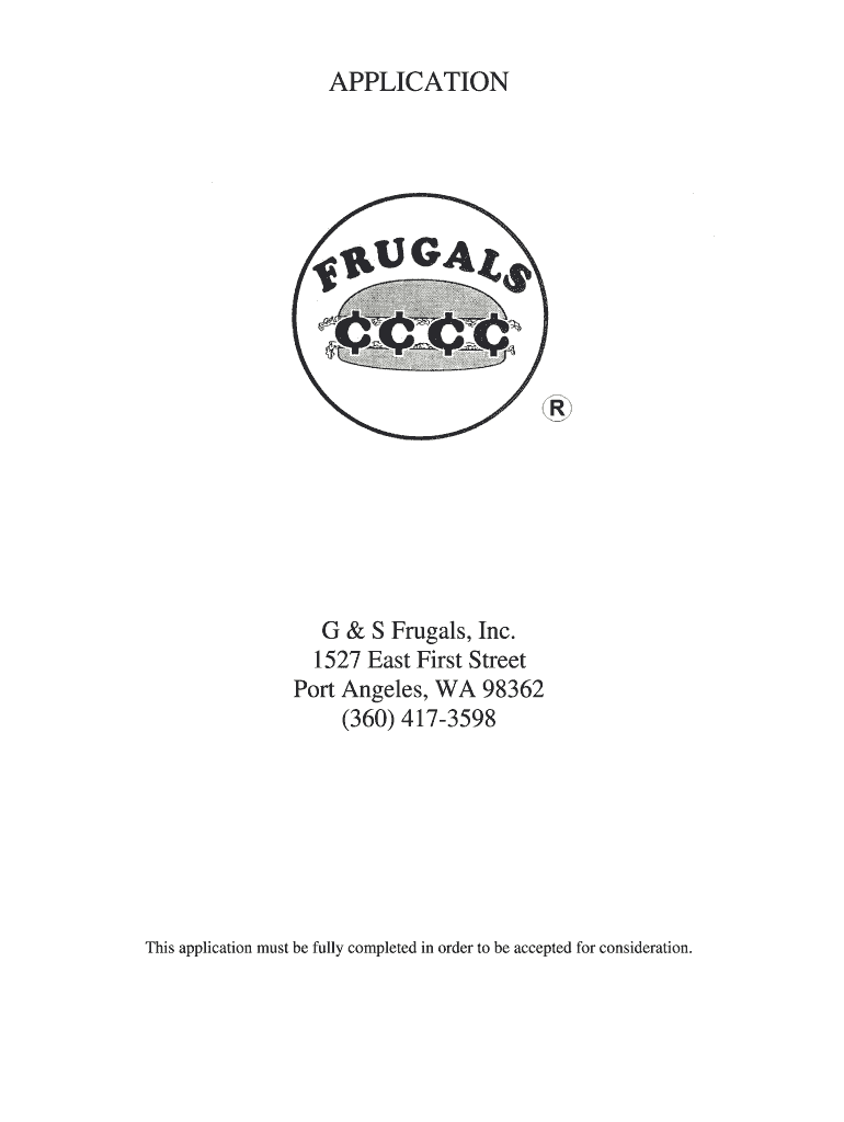 APPLICATION G & S Frugal, Inc. 1527 East First Street Port Angeles, WA 98362 (360) 4173598 This application must be fully completed in order to be accepted for consideration. GENERAL INFORMATION: