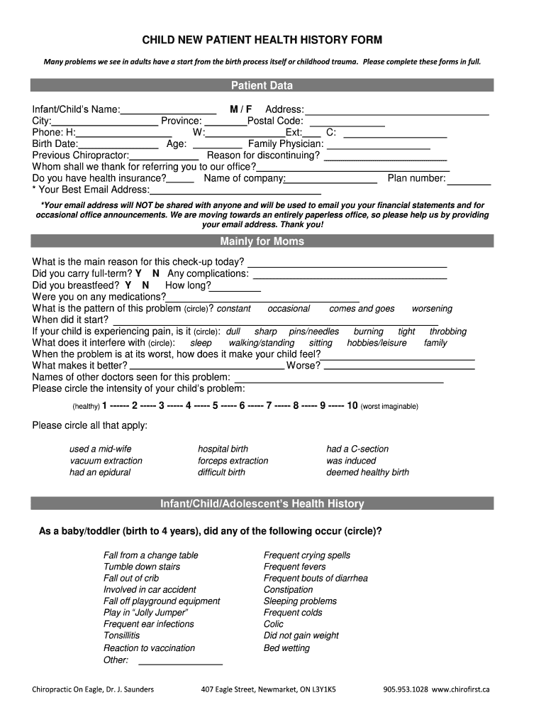 CHILD NEW PATIENT HEALTH HISTORY FORM Many problems we see in adults have a start from the birth process itself or childhood trauma. Please complete these forms in full. Patient Data Infant/Child's